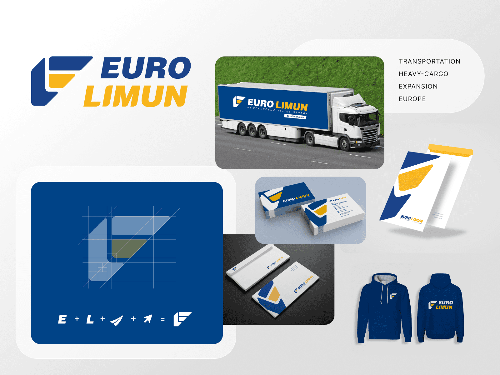 We created the new logomark that showcases the letters E and L from the name Euro Limun, combined with the upwards arrow that signifies the "lifting" action they are doing repeatedly, upwards movement and overall expansion. The logomark also symbolizes the road in perspective which is the place they spend most of their time - in transport.
